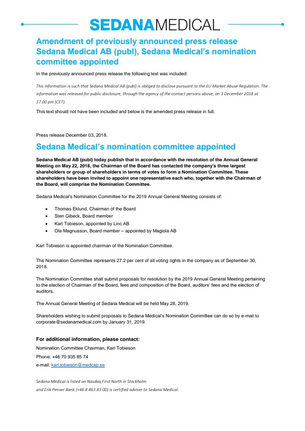 Sedana Medical AB (publ) today publish that in accordance with the resolution of the Annual General Meeting on May 22, 2018, the Chairman of the Board has contacted the company’s three largest shareholders or group of shareholders in terms of votes to form a Nomination Committee. These shareholders have been invited to appoint one representative each who, together with the Chairman of the Board, will comprise the Nomination Committee.