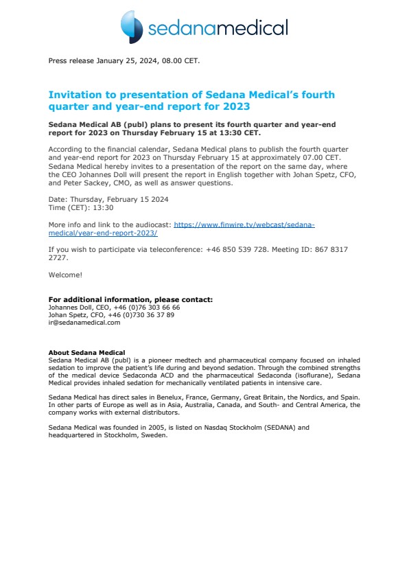 According to the financial calendar, Sedana Medical plans to publish the fourth quarter and year-end report for 2023 on Thursday February 15 at approximately 07.00 CET. Sedana Medical hereby invites to a presentation of the report on the same day, where the CEO Johannes Doll will present the report in English together with Johan Spetz, CFO, and Peter Sackey, CMO, as well as answer questions.