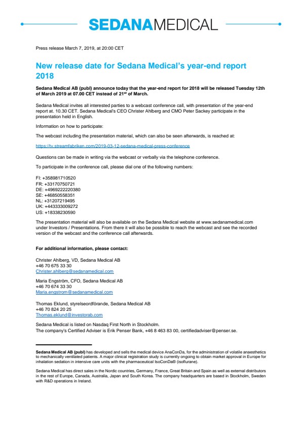 Sedana Medical invites all interested parties to a webcast conference call, with presentation of the year-end report at. 10.30 CET. Sedana Medical’s CEO Christer Ahlberg and CMO Peter Sackey participate in the presentation held in English.