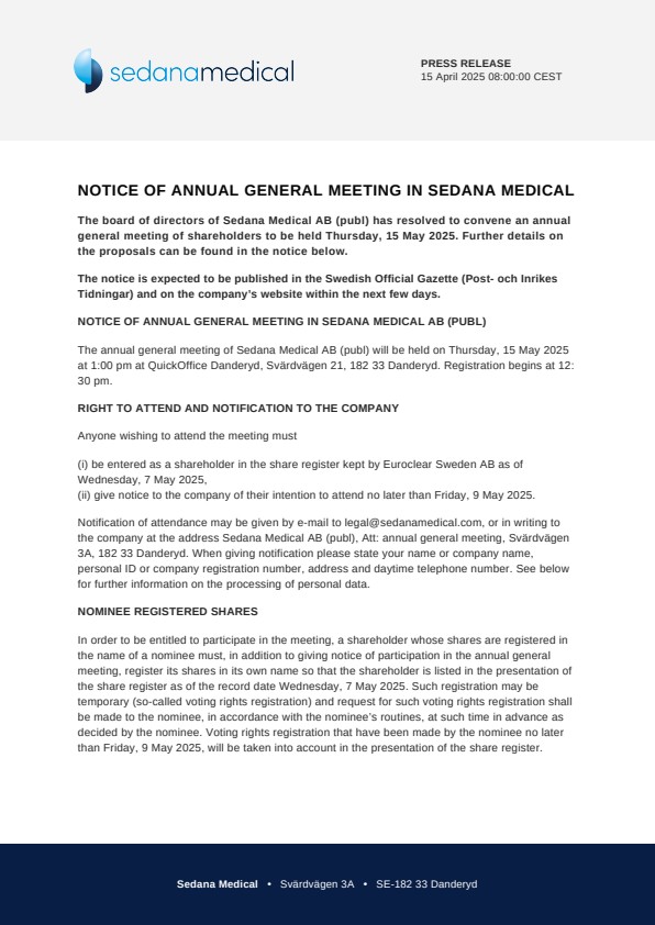 The annual general meeting of Sedana Medical AB (publ) will be held on Thursday, 15 May 2025 at 1:00 pm at QuickOffice Danderyd, Svärdvägen 21, 182 33 Danderyd. Registration begins at 12:30 pm.