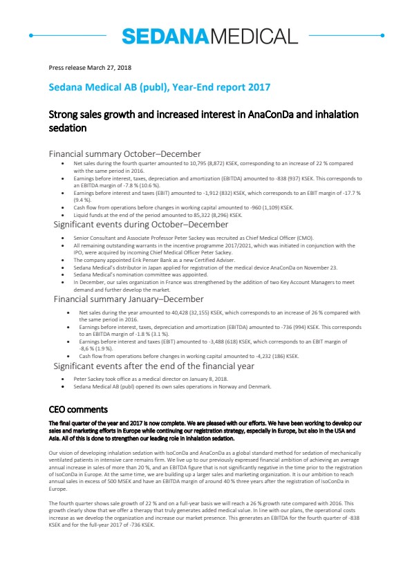 This information is such that Sedana Medical AB (publ) is obliged to disclose pursuant to the EU Market Abuse Regulation. The information was released for public disclosure, through the agency of the contact persons above, on 27 March 2018 at 07.00 AM (CET).