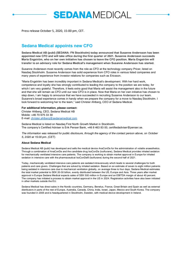 “Maria Engström has been incredibly important in Sedana Medical’s development. With her hard work, competence and loyalty she has strongly contributed to leading the company to the position we are today, for which I am very grateful. Therefore, it feels extra good that Maria will assist the management also in the future and that she will remain as CFO until our new CFO is in place. Now that Maria on her own initiative has chosen to step down, I am happy to announce that we have succeeded in recruiting Susanne Andersson to our team. Susanne’s broad experience comes in handy when we prepare the company for a move to Nasdaq Stockholm. I look forward to welcoming her to the team,” said Christer Ahlberg, CEO of Sedana Medical.