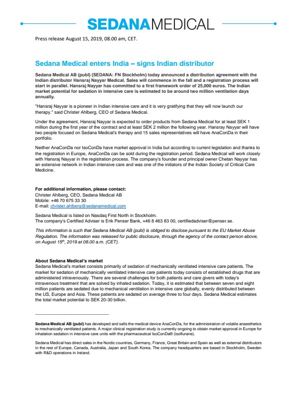 Under the agreement, Hansraj Nayyar is expected to order products from Sedana Medical for at least SEK 1 million during the first year of the contract and at least SEK 2 million the following year. Hansray Nayyar will have two people focused on Sedana Medical’s therapy and 15 sales representatives will have AnaConDa in their portfolio.