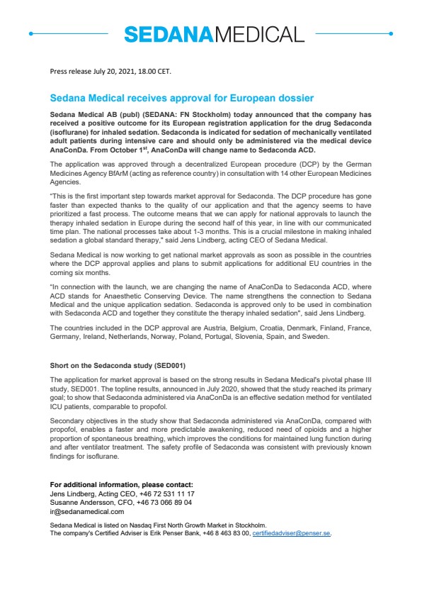 “This is the first important step towards market approval for Sedaconda. The DCP procedure has gone faster than expected thanks to the quality of our application and that the agency seems to have prioritized a fast process. The outcome means that we can apply for national approvals to launch the therapy inhaled sedation in Europe during the second half of this year, in line with our communicated time plan. The national processes take about 1-3 months. This is a crucial milestone in making inhaled sedation a global standard therapy,” said Jens Lindberg, acting CEO of Sedana Medical.