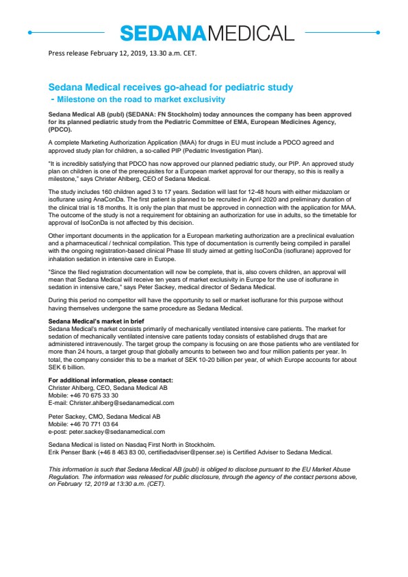 This information is such that Sedana Medical AB (publ) is obliged to disclose pursuant to the EU Market Abuse Regulation. The information was released for public disclosure, through the agency of the contact persons above, on February 12, 2019 at 13:30 a.m. (CET).