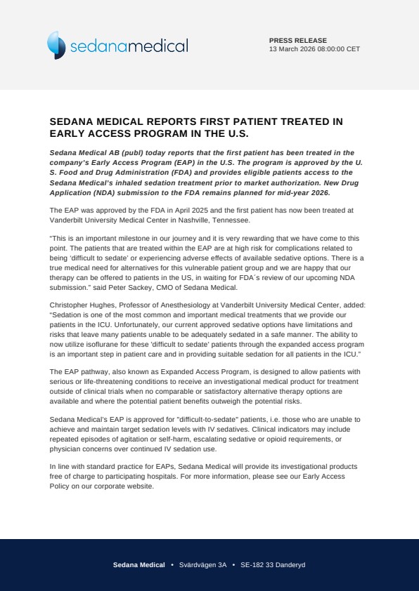 Sedana Medical AB (publ) today reports that the first patient has been treated in the company’s Early Access Program (EAP) in the U.S. The program is approved by the U.S. Food and Drug Administration (FDA) and provides eligible patients access to the Sedana Medical’s inhaled sedation treatment prior to market authorization. New Drug Application (NDA) submission to the FDA remains planned for mid-year 2026.
