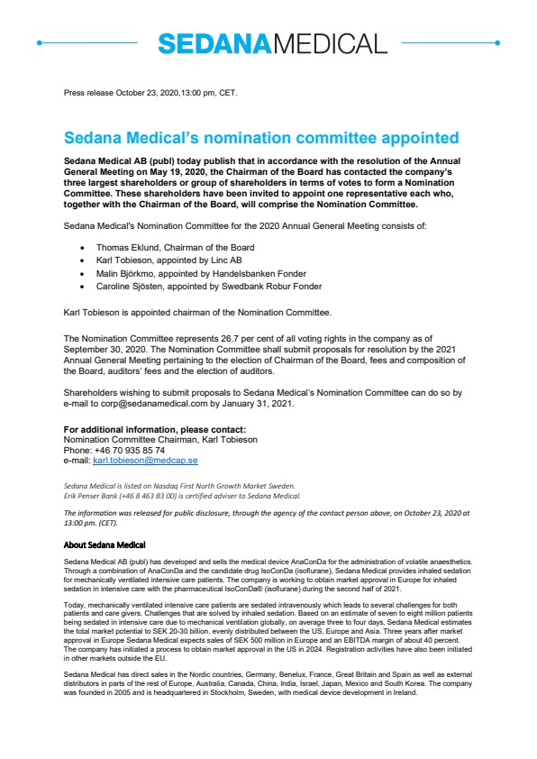 Sedana Medical’s Nomination Committee for the 2020 Annual General Meeting consists of: