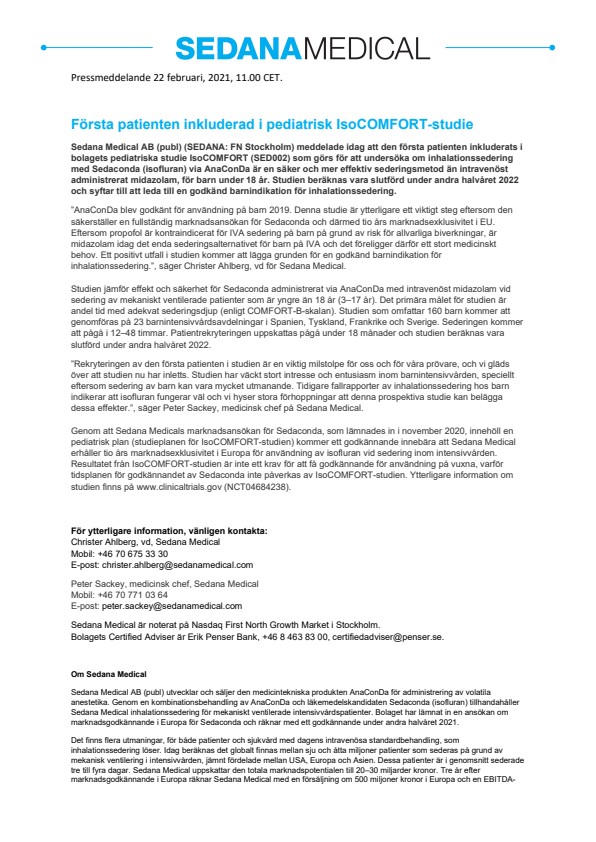 ”AnaConDa blev godkänt för användning på barn 2019. Denna studie är ytterligare ett viktigt steg eftersom den säkerställer en fullständig marknadsansökan för Sedaconda och därmed tio års marknadsexklusivitet i EU. Eftersom propofol är kontraindicerat för IVA sedering på barn på grund av risk för allvarliga biverkningar, är midazolam idag det enda sederingsalternativet för barn på IVA och det föreligger därför ett stort medicinskt behov. Ett positivt utfall i studien kommer att lägga grunden för en godkänd barnindikation för inhalationssedering.”, säger Christer Ahlberg, vd för Sedana Medical.