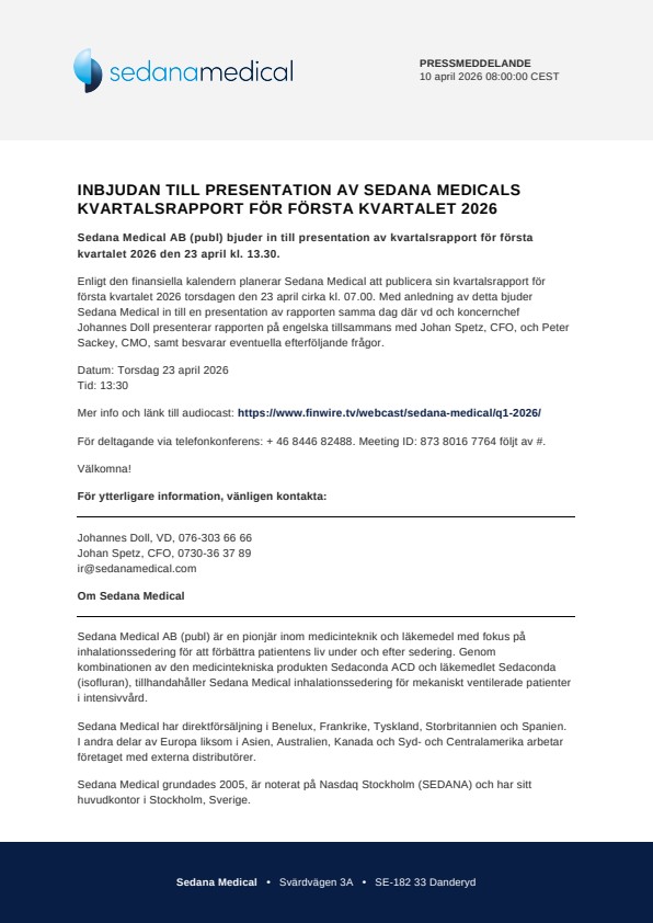 Enligt den finansiella kalendern planerar Sedana Medical att publicera sin kvartalsrapport för första kvartalet 2026 torsdagen den 23 april cirka kl. 07.00. Med anledning av detta bjuder Sedana Medical in till en presentation av rapporten samma dag där vd och koncernchef Johannes Doll presenterar rapporten på engelska tillsammans med Johan Spetz, CFO, och Peter Sackey, CMO, samt besvarar eventuella efterföljande frågor.