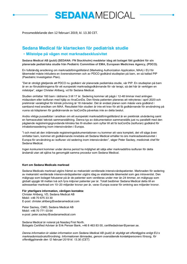 ”Det är otroligt glädjande att PDCO nu godkänt vår planerade pediatriska studie, vår PIP. En studieplan på barn är en av förutsättningarna för ett europeiskt marknadsgodkännande för vår terapi, så det här är verkligen en milstolpe”, säger Christer Ahlberg, vd för Sedana Medical.