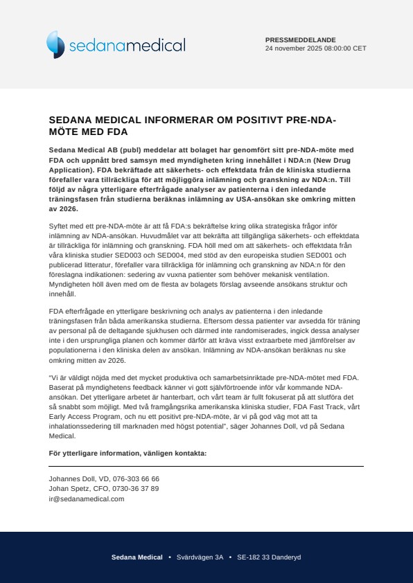 Sedana Medical AB (publ) meddelar att bolaget har genomfört sitt pre-NDA-möte med FDA och uppnått bred samsyn med myndigheten kring innehållet i NDA:n (New Drug Application). FDA bekräftade att säkerhets- och effektdata från de kliniska studierna förefaller vara tillräckliga för att möjliggöra inlämning och granskning av NDA:n. Till följd av några ytterligare efterfrågade analyser av patienterna i den inledande träningsfasen från studierna beräknas inlämning av USA-ansökan ske omkring mitten av 2026.