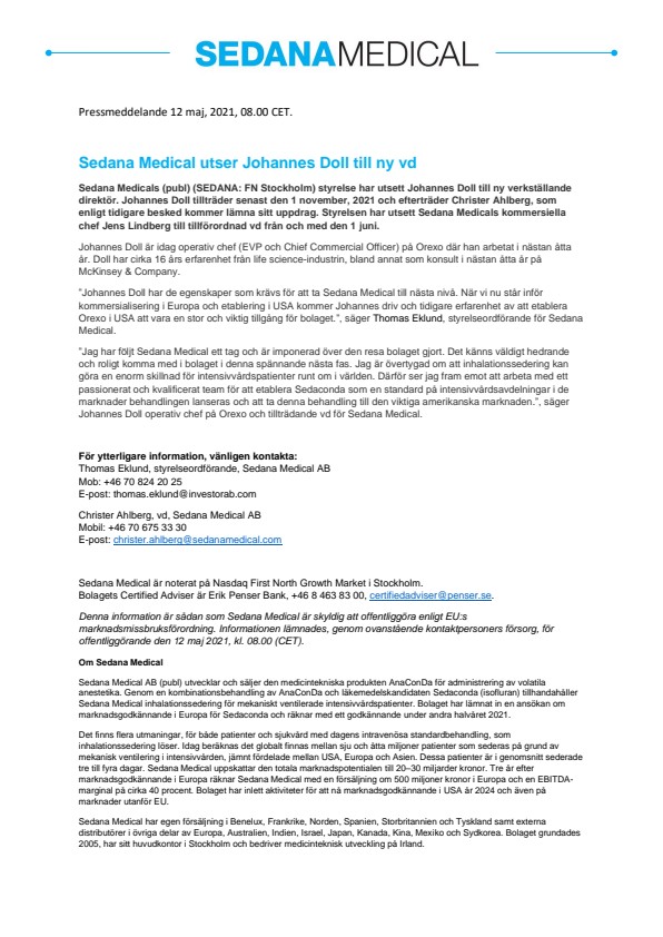”Jag har följt Sedana Medical ett tag och är imponerad över den resa bolaget gjort. Det känns väldigt hedrande och roligt komma med i bolaget i denna spännande nästa fas. Jag är övertygad om att inhalationssedering kan göra en enorm skillnad för intensivvårdspatienter runt om i världen. Därför ser jag fram emot att arbeta med ett passionerat och kvalificerat team för att etablera Sedaconda som en standard på intensivvårdsavdelningar i de marknader behandlingen lanseras och att ta denna behandling till den viktiga amerikanska marknaden.”, säger Johannes Doll operativ chef på Orexo och tillträdande vd för Sedana Medical.